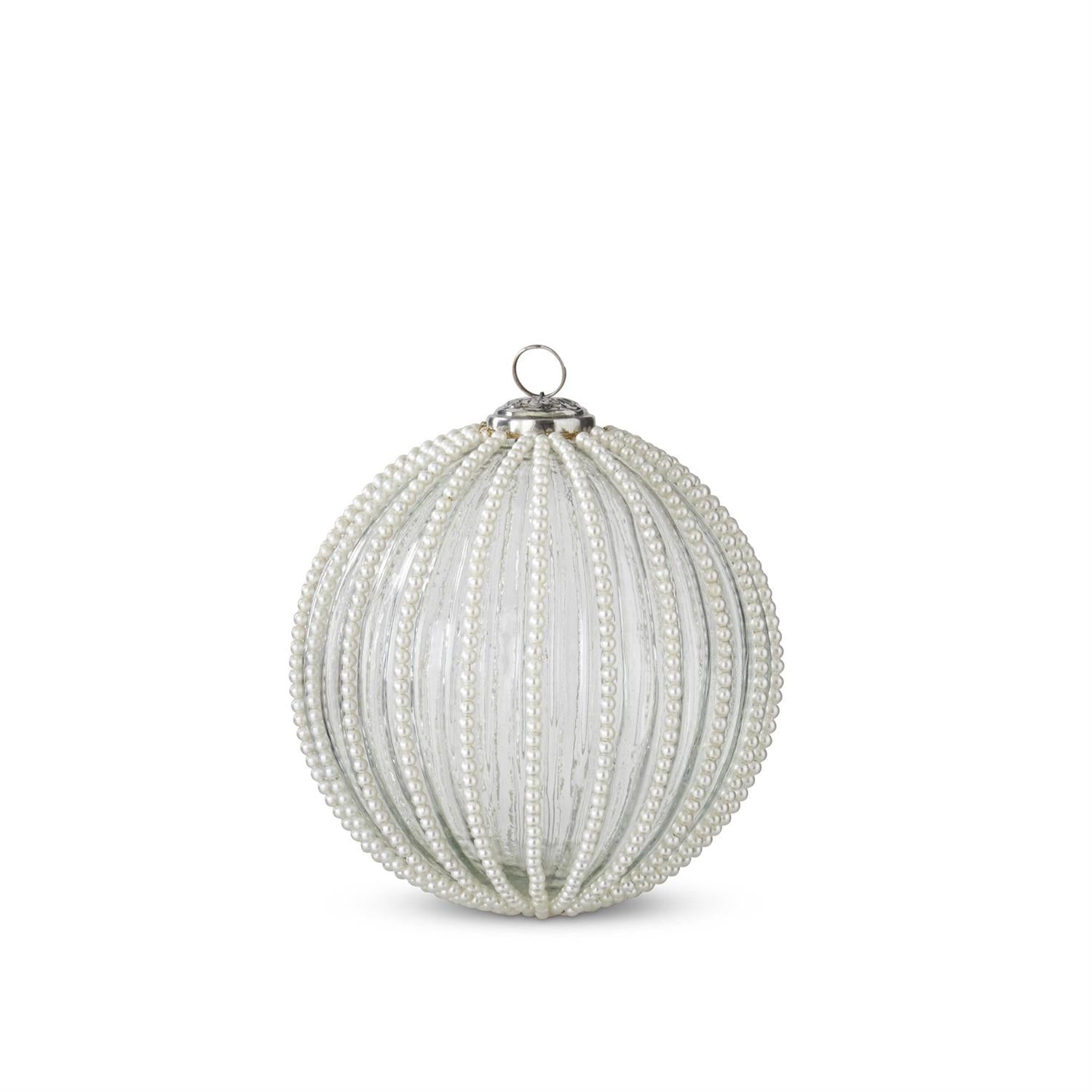 6" Round Clear Glass Ornament with White Pearl BeadingĀ